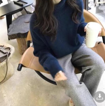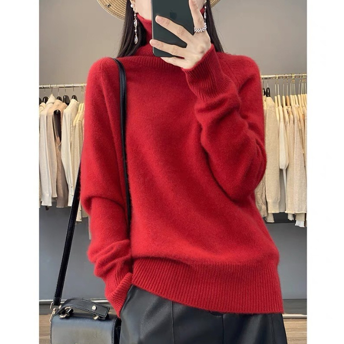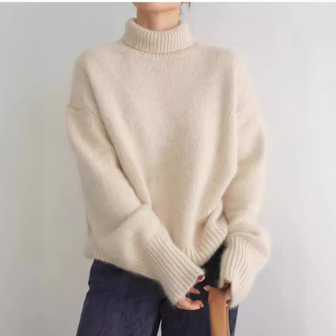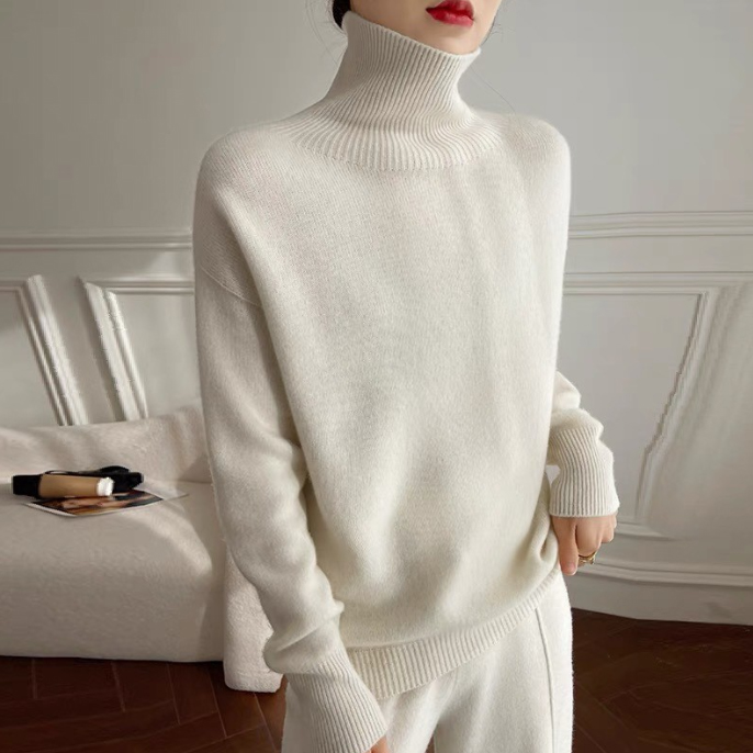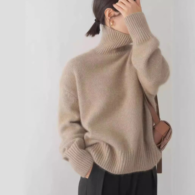 首元をすっきりと包み込むタートルネックが上品で知的な印象をプラス