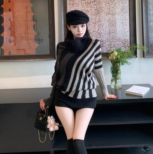おしゃれなボーダー柄が印象的なハイネックニットセーターです。
