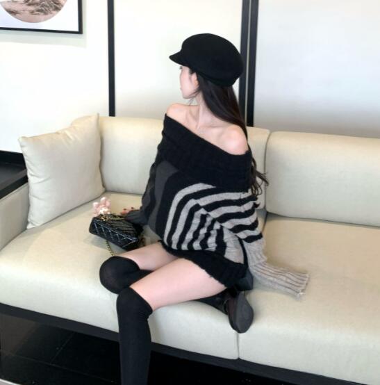 ハイネック部分を片側に下ろすことで肩を美しく見せる大人っぽい着こなしが楽しめます