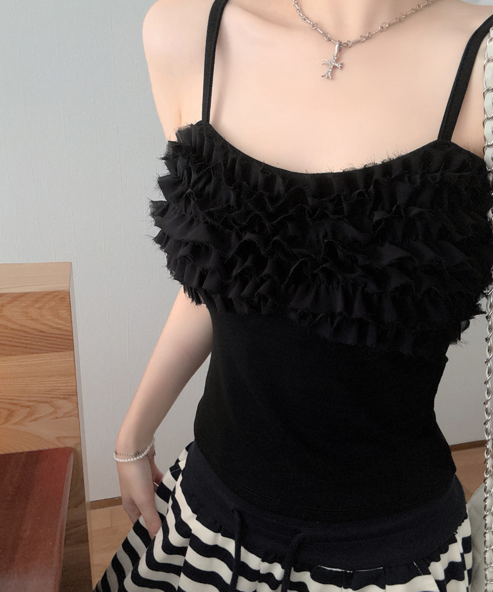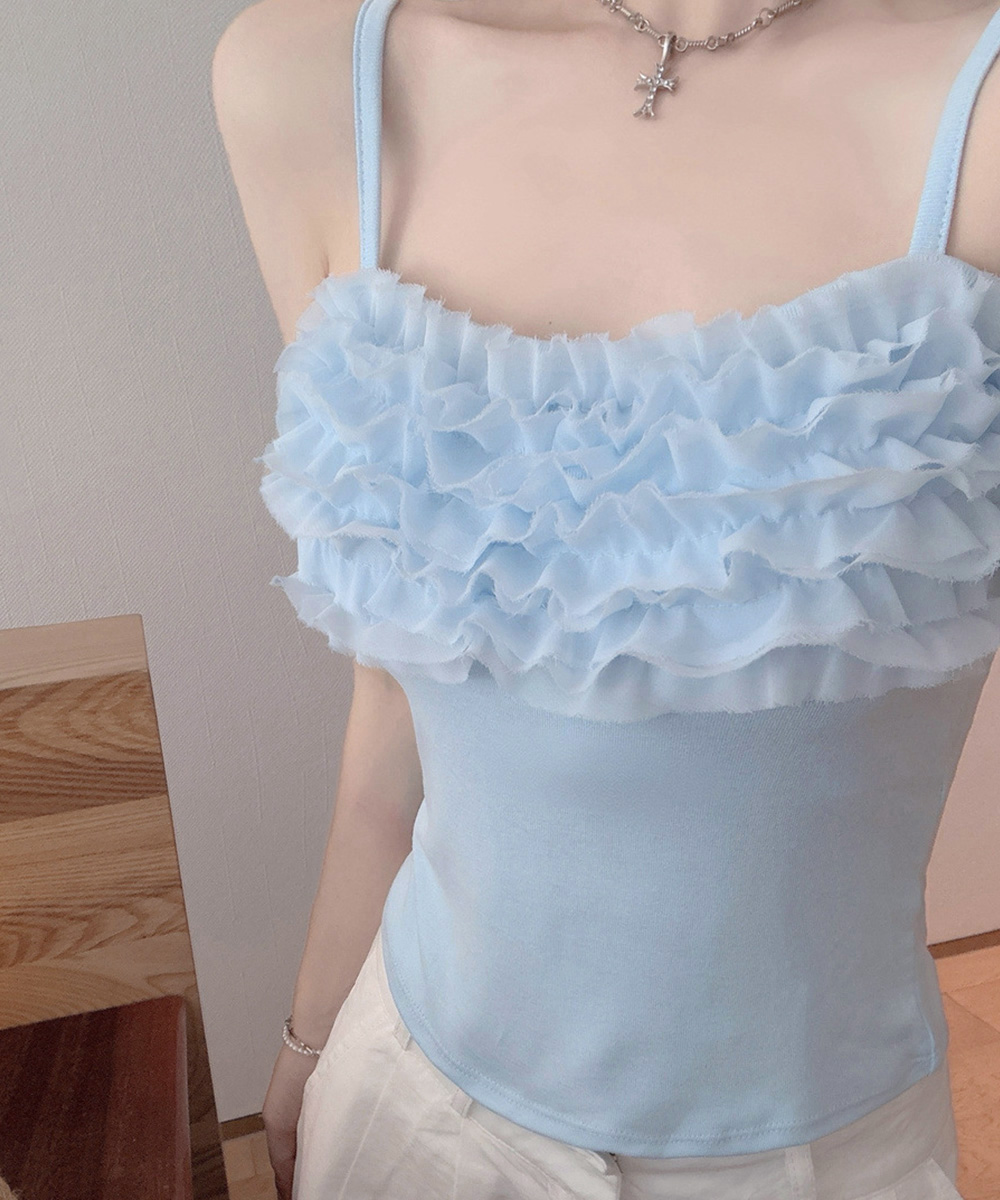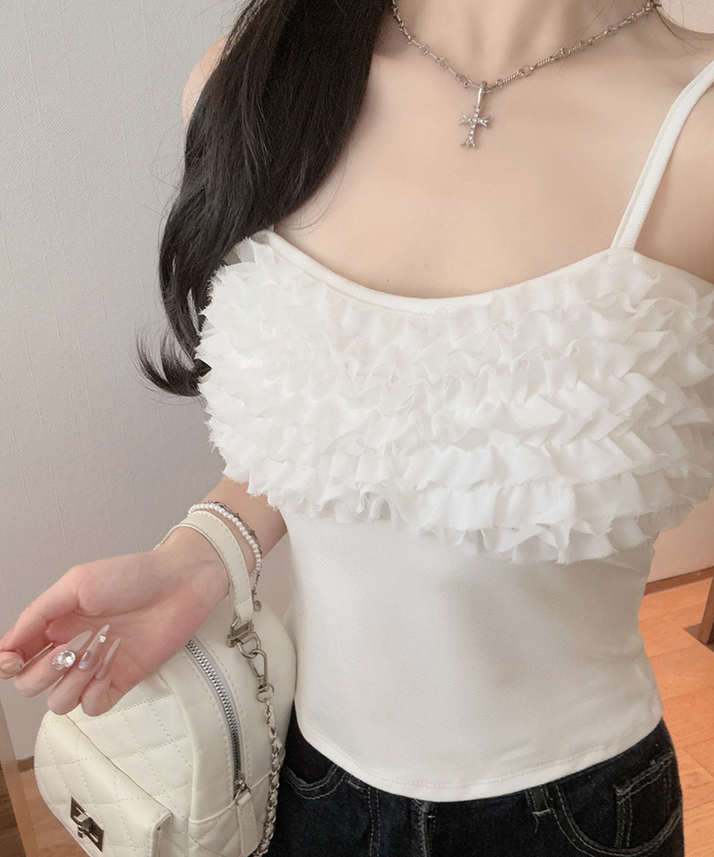 胸元の立体的なフリルが印象的な、大人可愛いノースリーブキャミソール。