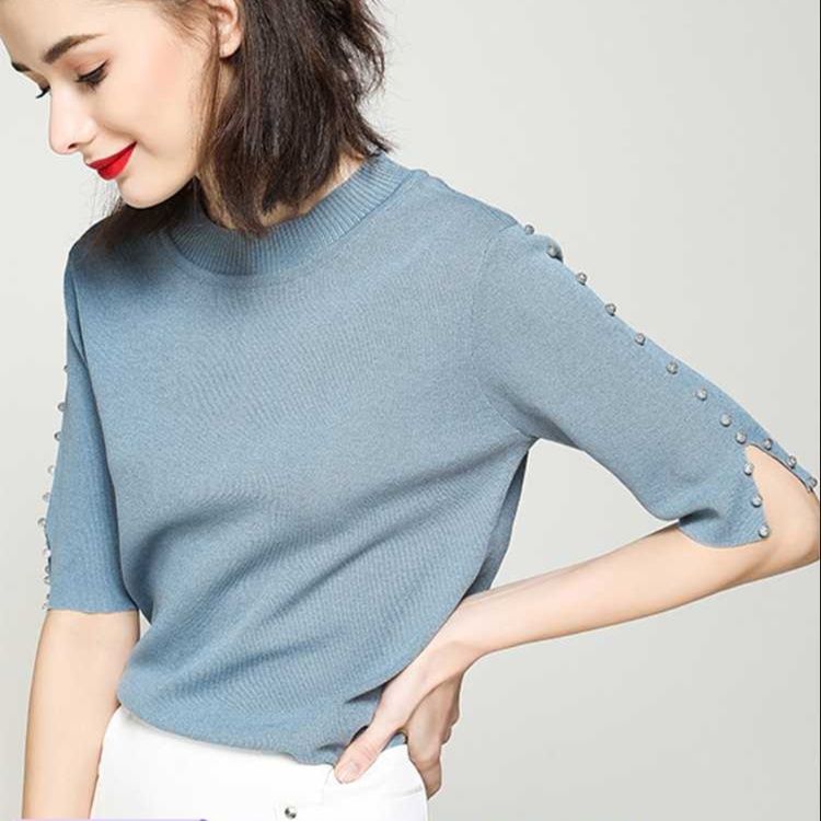 上品な印象を与える小さなパール装飾が特徴的な半袖カットソーです。