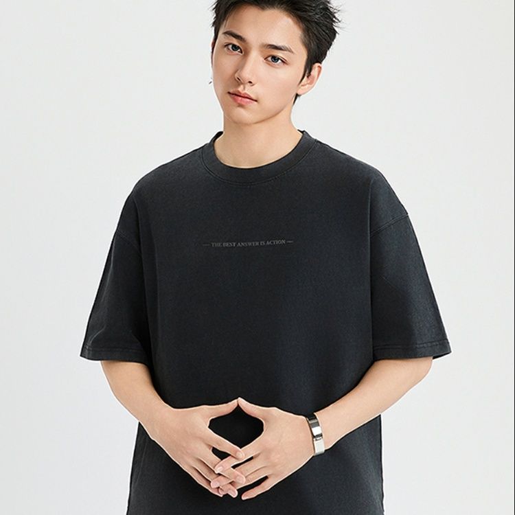 胸元の控えめな文字デザインが洗練された印象を与える半袖トップス。